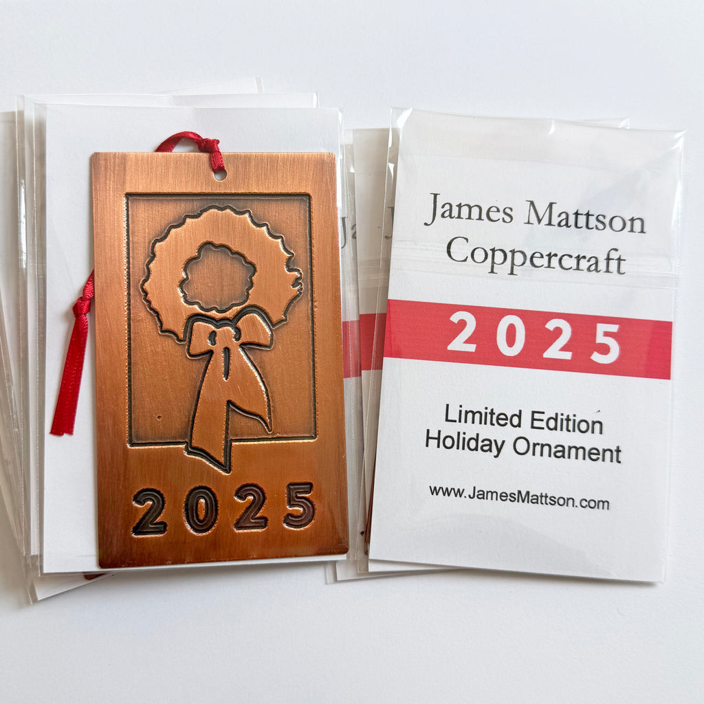 New for 2025! This limited edition holiday ornament is made from etched copper with a hand-rubbed finish. It measures 2 1/2" wide x 4 1/8" high and has a ribbon for hanging. Packed in a clear sleeve -- it's a great stocking stuffer.
