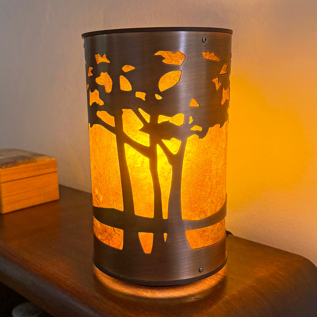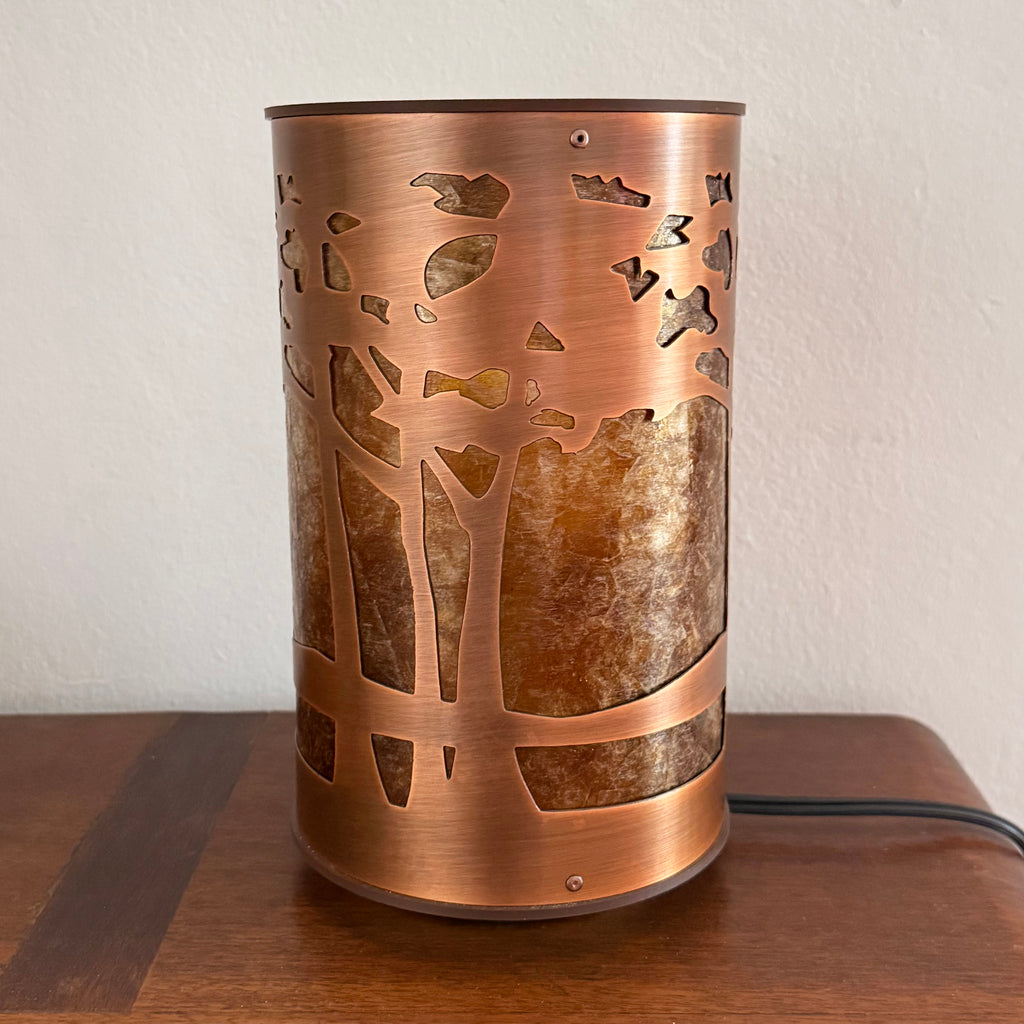 Here is another varation of the Mattson Sunglow lamp, with a simple short base that lets the handmade etched copper and mica shade shine. The on/off switch is on the cord, and a globe-shaped 60-watt-equivalent LED bulb is included. The overall dimensions are approximately 5 1/2 inches in diameter and 9 3/8 inches high.